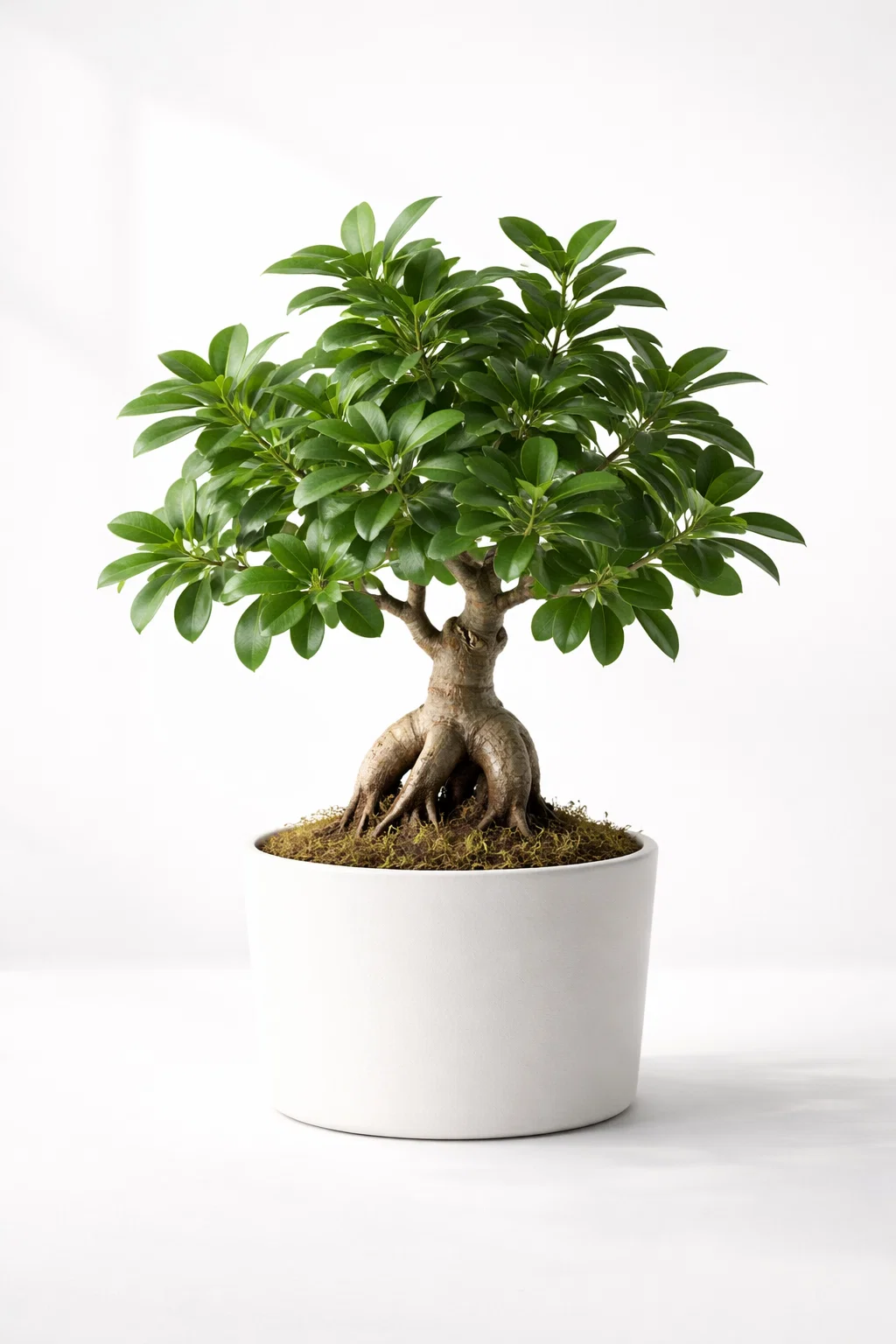 Each leaf has a smooth oval shape and a vibrant green color that contrasts beautifully with the rugged bark of the trunk. When the foliage grows evenly across the branches, the plant forms a balanced miniature tree silhouette. This unique structure makes the bonsai a centerpiece in indoor plant arrangements.